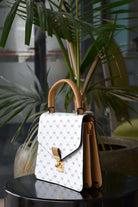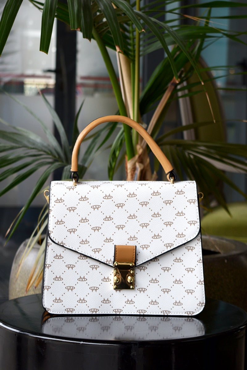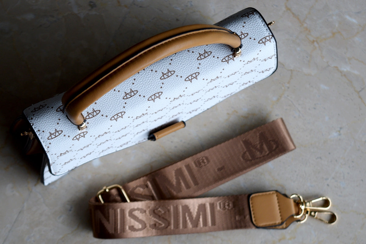 Geantă de damă de culoare alb-maro,fabricată din piele eco de înaltă calitate.Geanta are 2 compartimente cu interior căptușit și dispune de un compartiment extra cu fermoar.Prezintă închidere prin clipsare si deține elemente metalice de culoare aurie.Dispune de un cordon lung care permite purtarea acesteia ca și geantă crossbody.