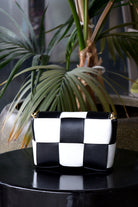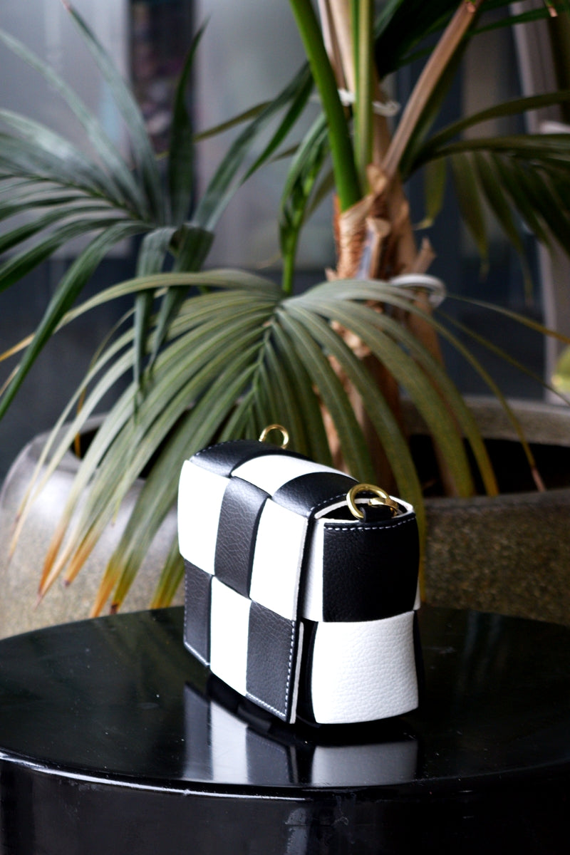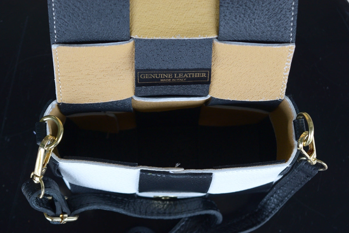 Geantă de damă de culoare alb-negru, fabricată din piele de înaltă calitate. Geanta are 1 compartiment cu interior necăptușit. Prezintă închidere prin clipsare și deține elemente metalice de culoare aurie. Dispune de un cordon lung care permite purtarea acesteia ca și geantă crossbody.