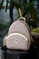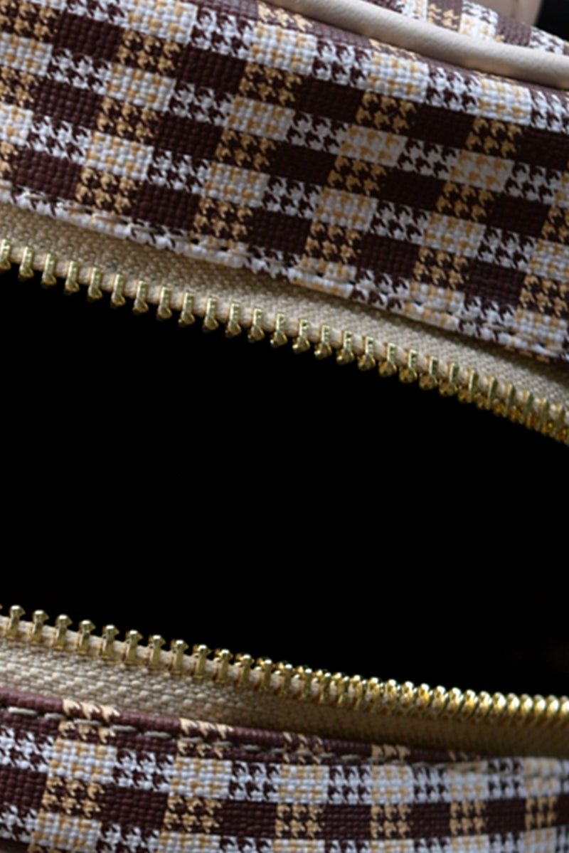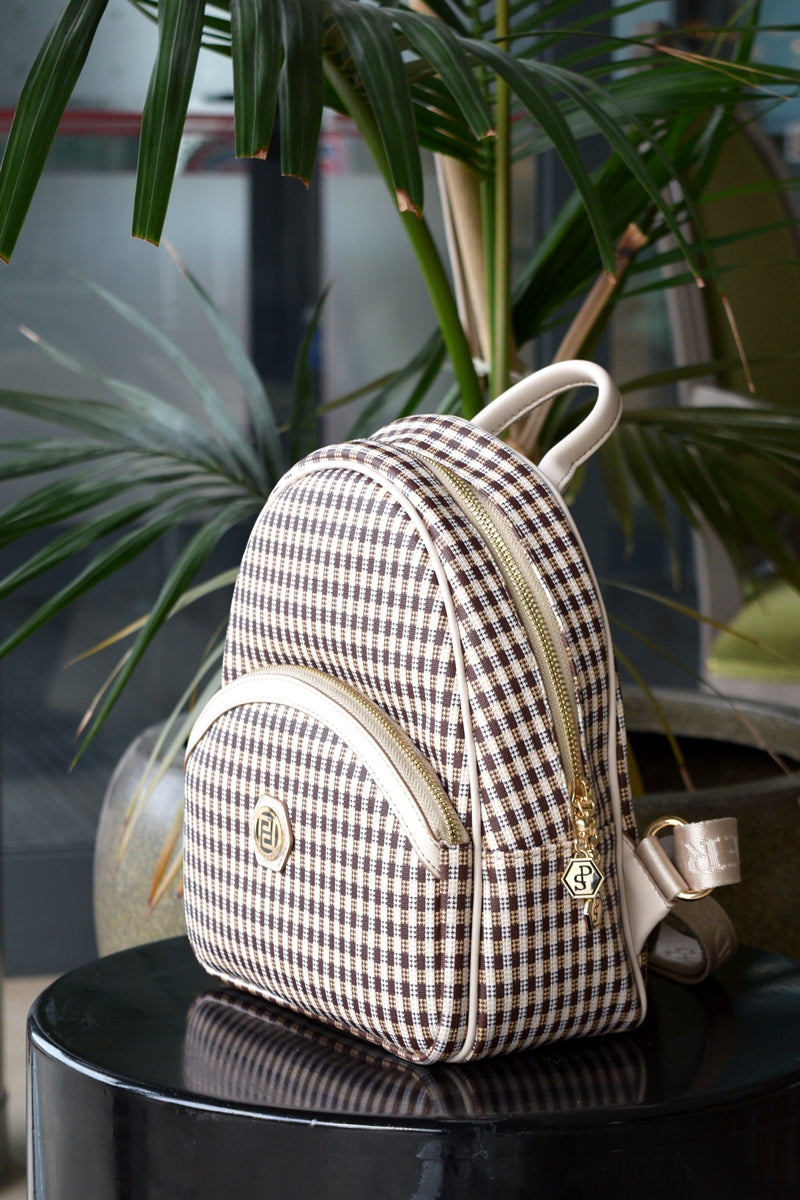 Geantă de damă de culoare bej-negru, fabricată din piele de înaltă calitate. Geanta are 1 compartiment cu interior căptușit și dispune de două buzunare: un buzunar pentru telefon, un buzunar mic cu fermoar și un buzunar exterior cu fermoar. Prezintă închidere cu fermoar metalic și deține elemente metalice de culoare aurie. Dispune de două bretele reglabile, care permit purtarea acesteia pe umeri.