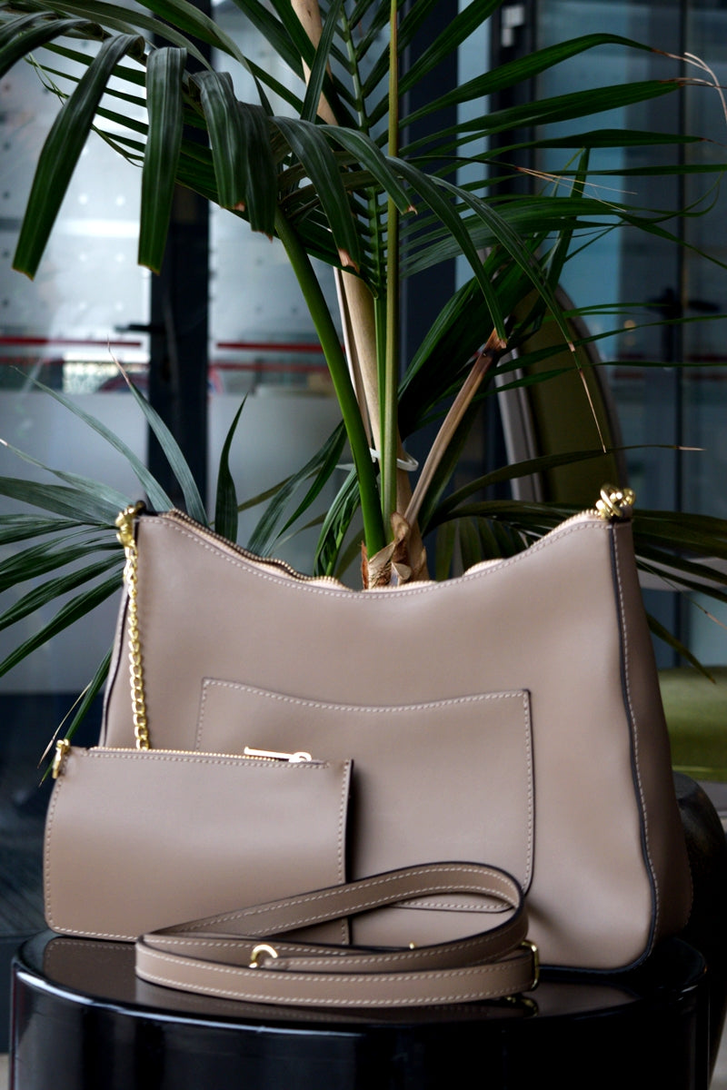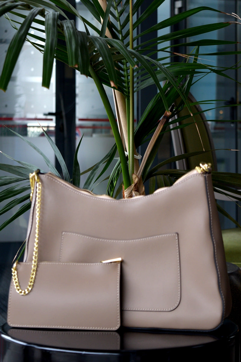 Interiorul este căptușit și bine organizat, oferind un compartiment principal spațios, două buzunare interioare (unul pentru telefon și unul cu fermoar) și un buzunar aplicat în față, ideal pentru acces rapid la obiectele mici. În plus, geanta vine însoțită de un portofel elegant asortat, pentru un plus de utilitate și stil.