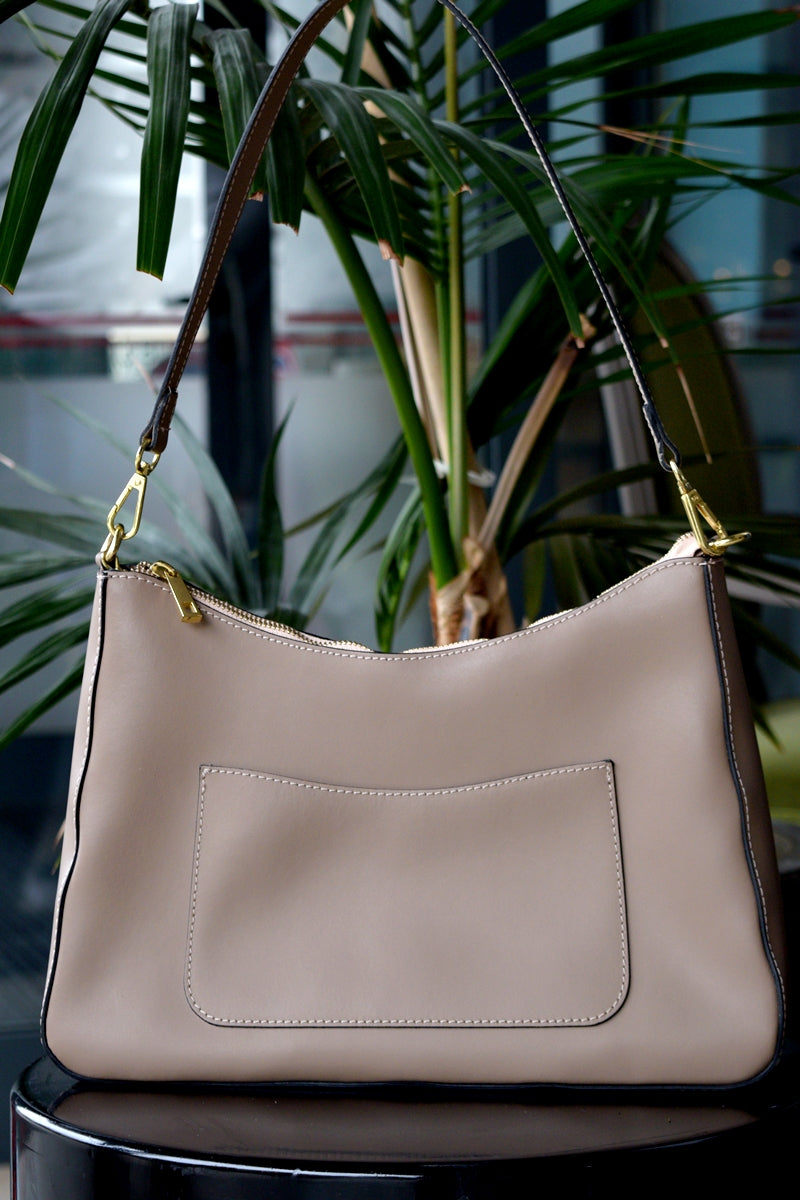 Completează-ți ținutele cu o notă de stil discret și rafinat alegând această geantă de damă în nuanță de crem-închis. Confecționată din piele de înaltă calitate, geanta impresionează prin designul său clasic și funcționalitatea perfectă pentru zi cu zi.