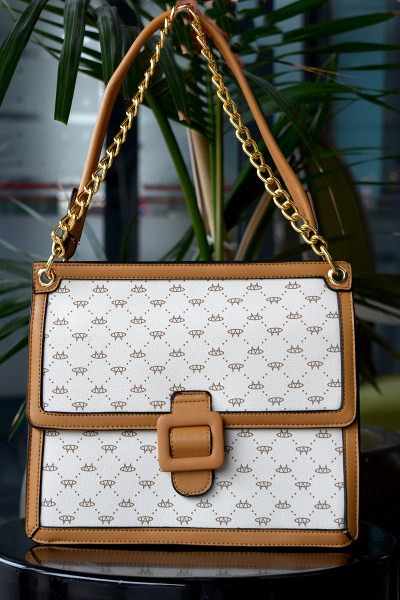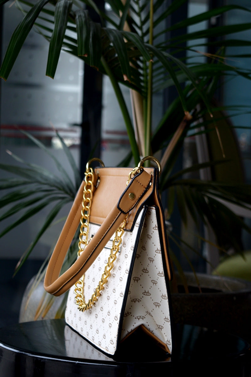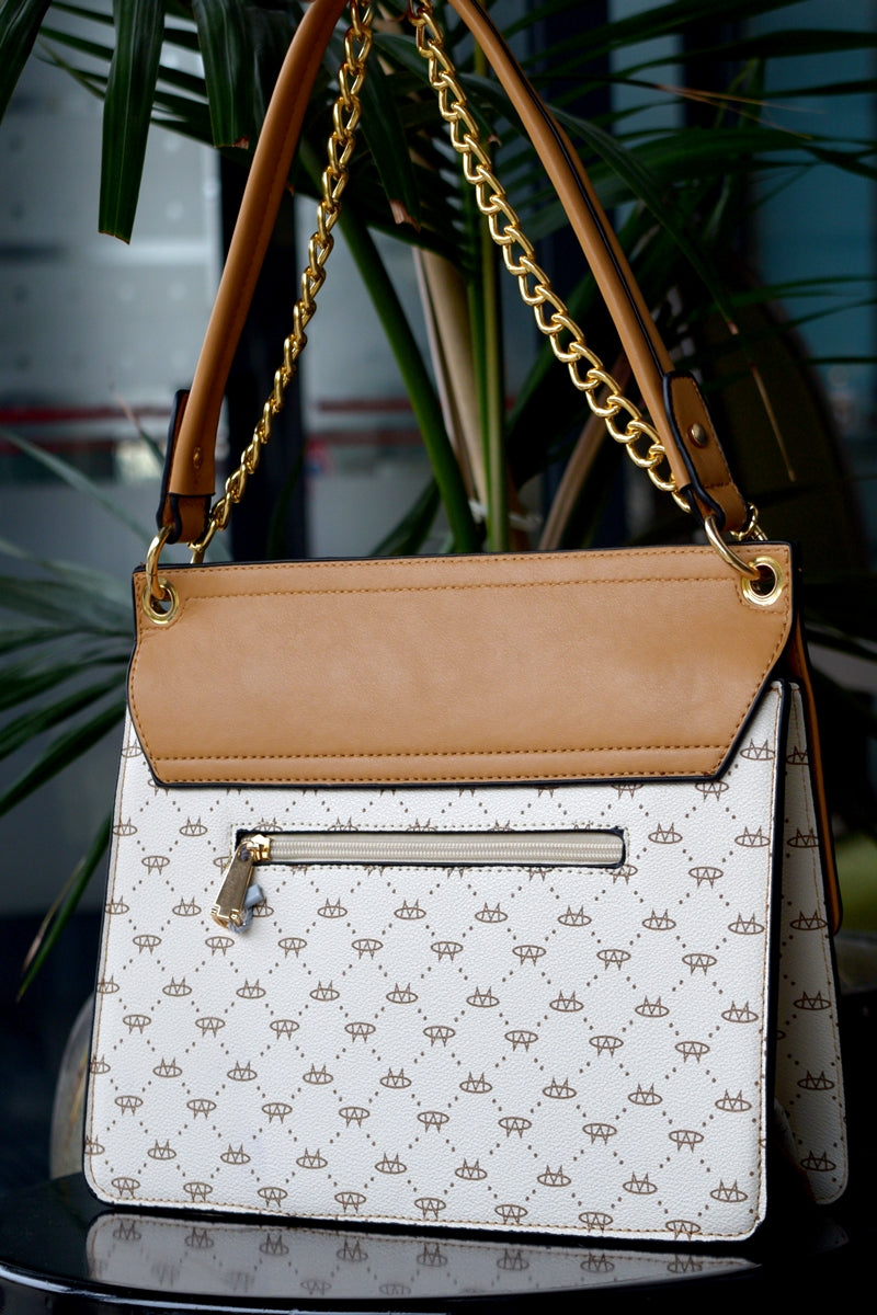Geantă de damă de culoare crem-maro,fabricată din piele eco de înaltă calitate.Geanta are 2 compartiment cu interior căptușit și extra buzunar cu fermoar , dispune de două buzunare:un buzunar pentru telefon si un buzunar mic cu fermoar.Prezintă inchidere prin clipsare la exterior si prin fermoar metalic la interior si deține elemente metalice de culoare aurie.Dispune de un cordon lung care permite purtarea acesteia ca și geanta crossbody.