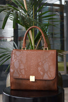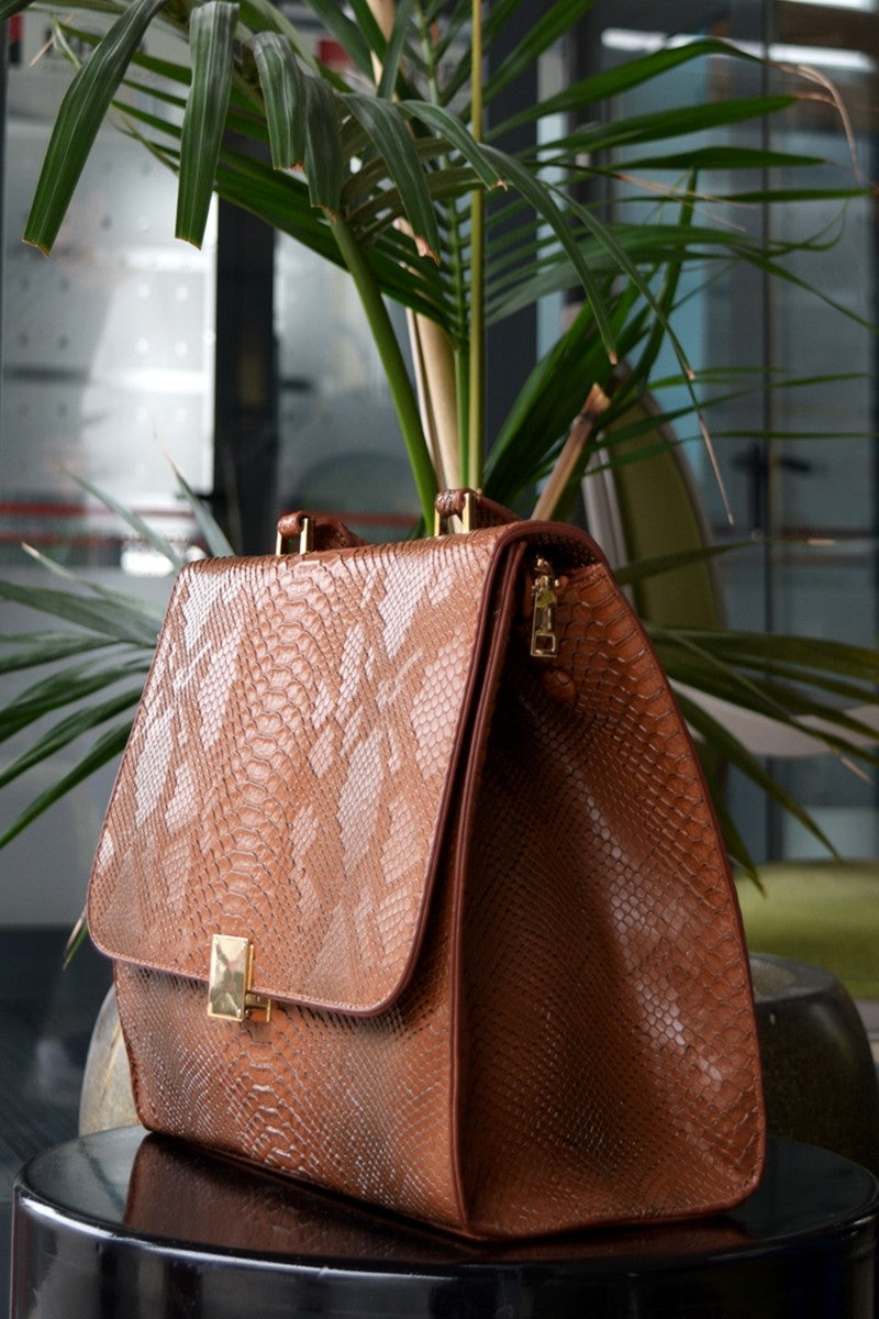 Geantă de damă de culoare maro cu imprimeu de piele de șarpe, fabricată din piele eco de înaltă calitate. Geanta are un compartiment cu interior căptușit și dispune de două buzunare: un buzunar pentru telefon și un buzunar mic cu fermoar. Prezintă închidere cu fermoar metalic și închidere prin clipsare, deține elemente metalice de culoare aurie și un buzunar exterior. Dispune de un cordon lung care permite purtarea acesteia ca și geantă crossbody.