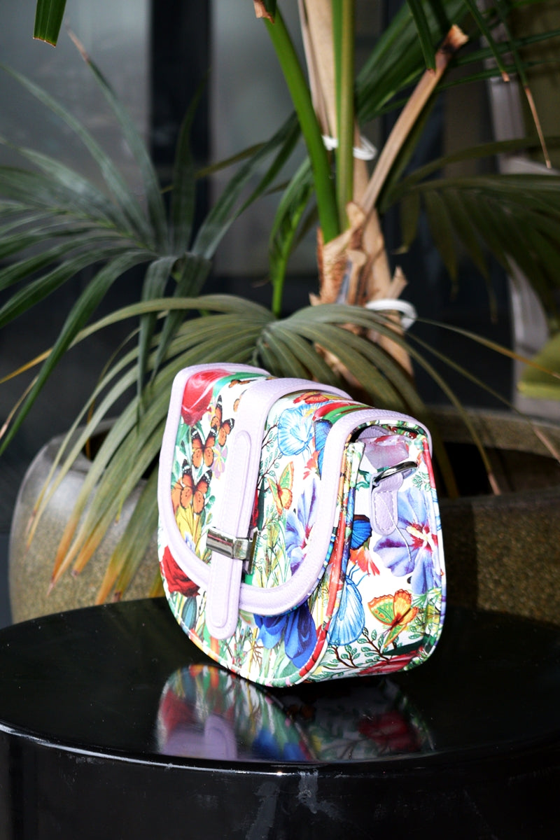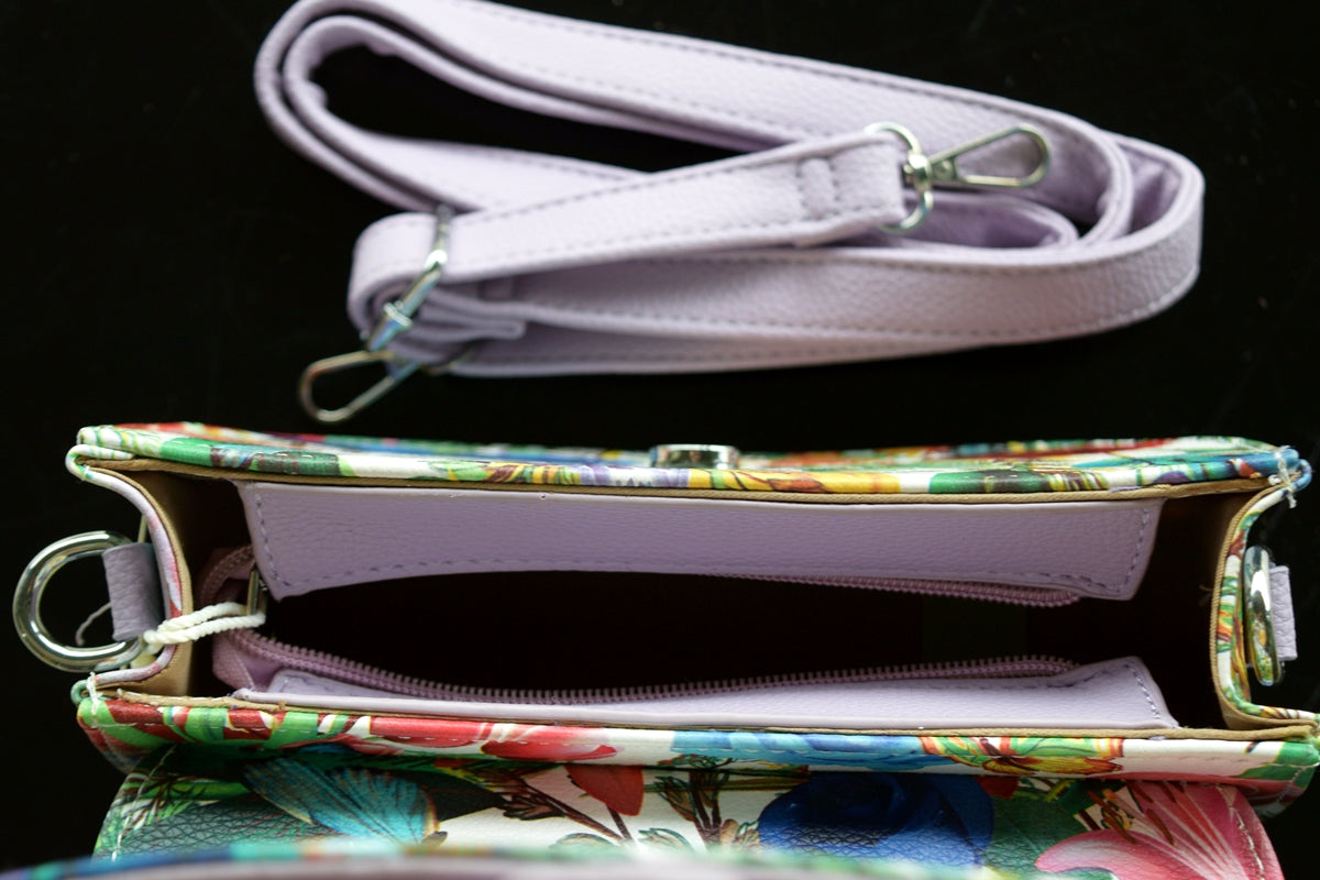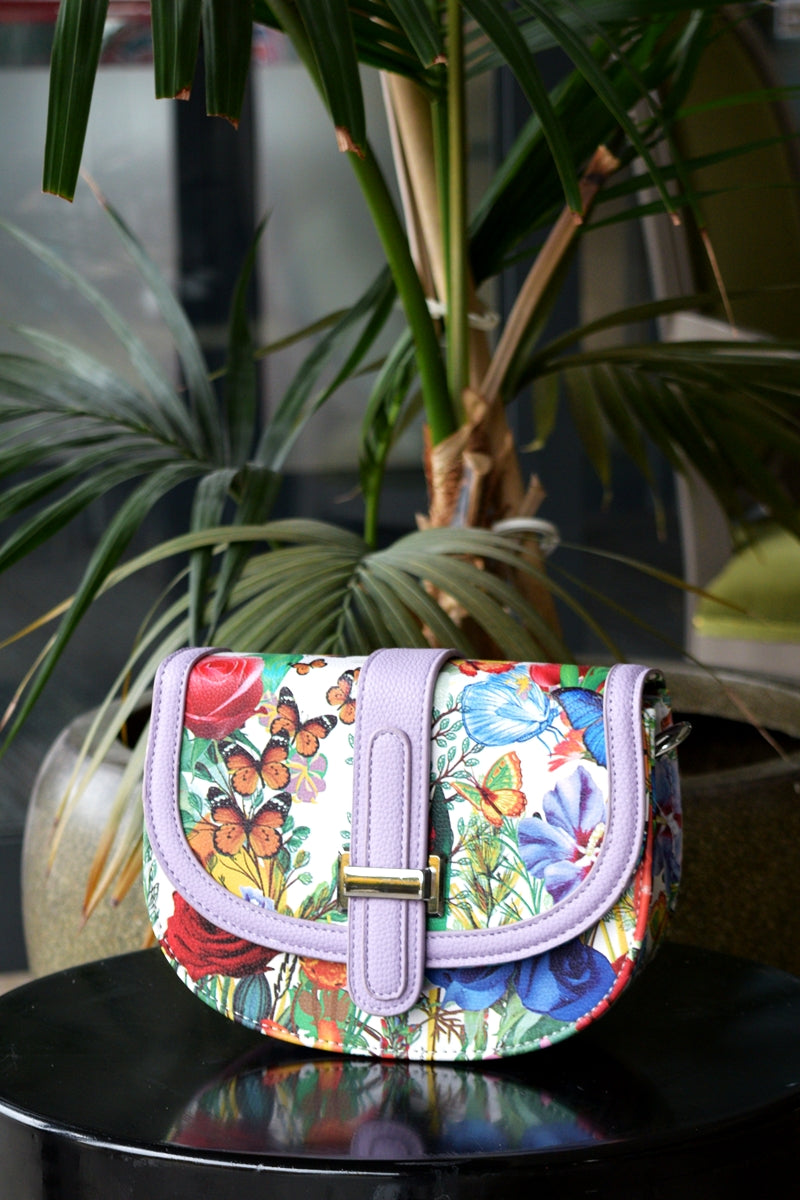 Geantă de damă de culoare multicoloră, fabricată din piele de înaltă calitate. Geanta are 1 compartiment cu interior căptușit și dispune de un buzunar mic cu fermoar la interior. Prezintă închidere prin clipsare și deține elemente metalice de culoare argintie. Dispune de un cordon lung care permite purtarea acesteia ca și geantă crossbody.
