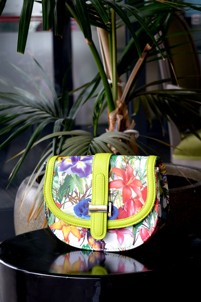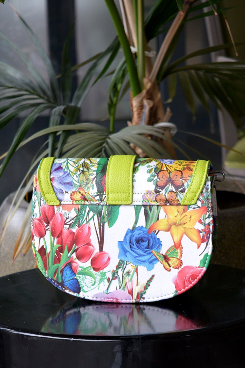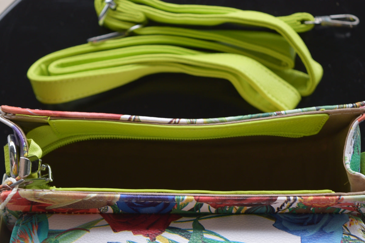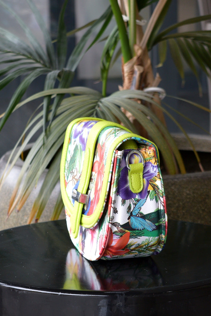 Geantă de damă de culoare multicoloră, fabricată din piele de înaltă calitate. Geanta are 1 compartiment cu interior căptușit și dispune de un buzunar mic cu fermoar la interior. Prezintă închidere prin clipsare și deține elemente metalice de culoare argintie. Dispune de un cordon lung care permite purtarea acesteia ca și geantă crossbody.