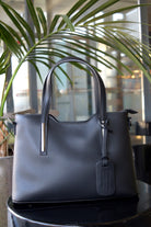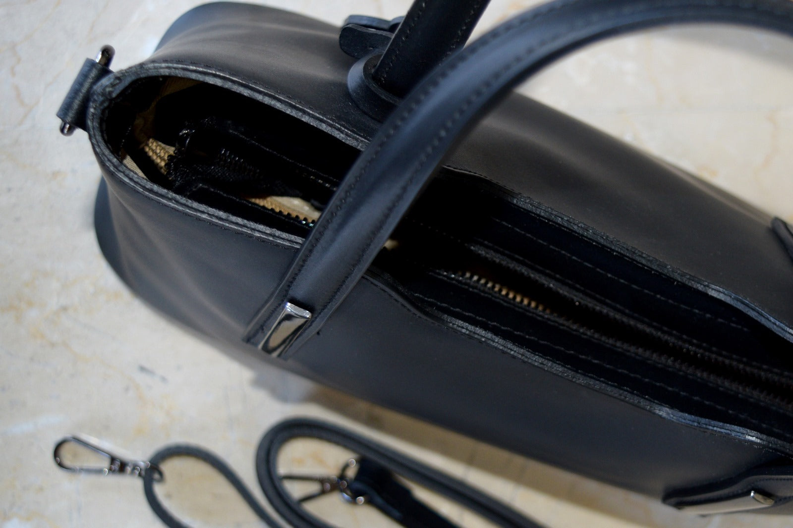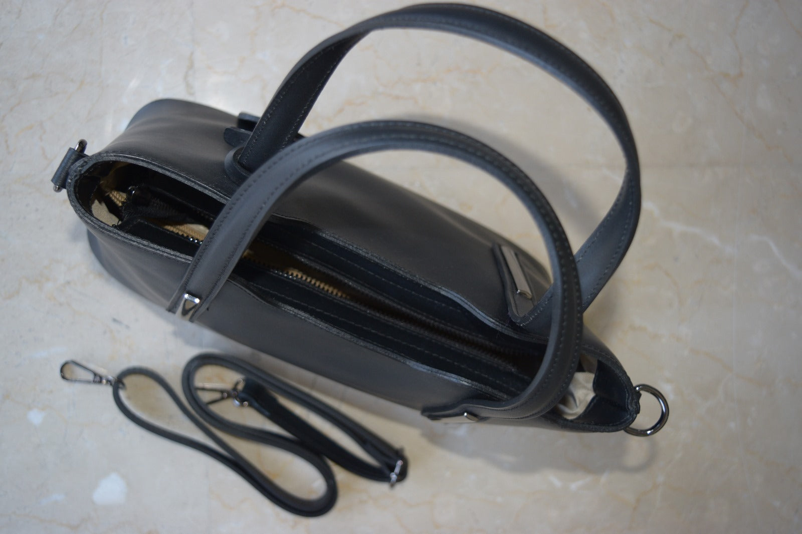 Geantă de damă, de culoare neagră,fabricată din piele de inalta calitate.Geanta are 2 compartimente căpusite si un buzunar-compartiment extra cu fermoar.Dispune de două buzunare interioare :un buzunar pentru telefon si un buzunar mic cu fermoar.Are inchidere prin fermoar metalic si detine componente metalice de culoare argintie.Deține o curea lungă care permite purtarea ca si geanta crossbody.