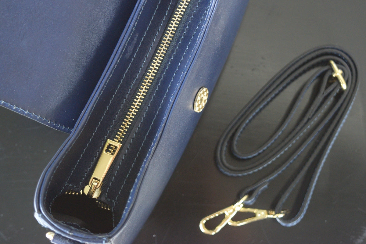 Geantă de damă de culoare neagră,fabricată din piele de înaltă calitate.Geanta are 1 compartiment cu interior captușit și dispune de un buzunar mic cu fermoar.Prezintă inchidere cu fermoar metalic și prin clipsare , detine elemente metalice de culoare aurie.Dispune de un cordon lung care permite purtarea acesteia ca si geantă crossbody.