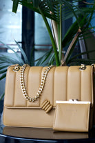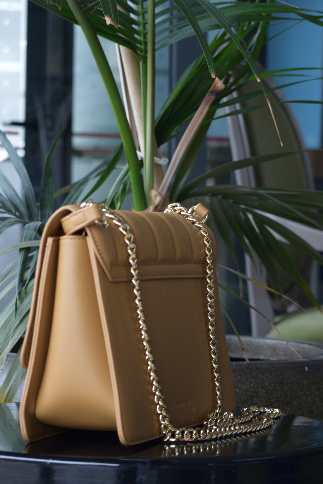 Geantă de damă de culoare nude, fabricată din piele ecologică de înaltă calitate. Geanta are un compartiment cu interior căptușit și dispune de două buzunare: un buzunar pentru telefon și un buzunar mic cu fermoar. Prezintă închidere cu fermoar metalic și deține elemente metalice de culoare aurie. Dispune de un cordon lung care permite purtarea acesteia ca și geantă crossbody. Geanta conține și un portofel.