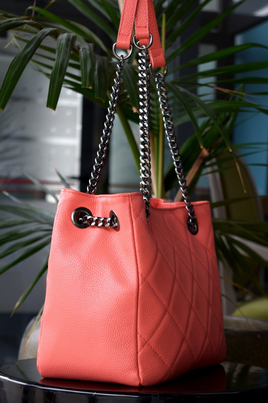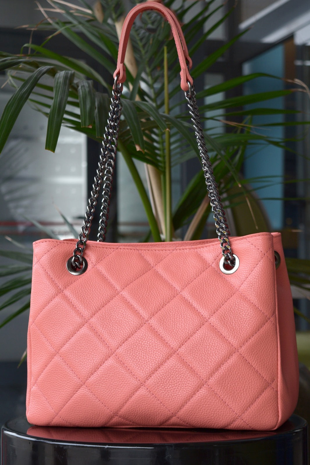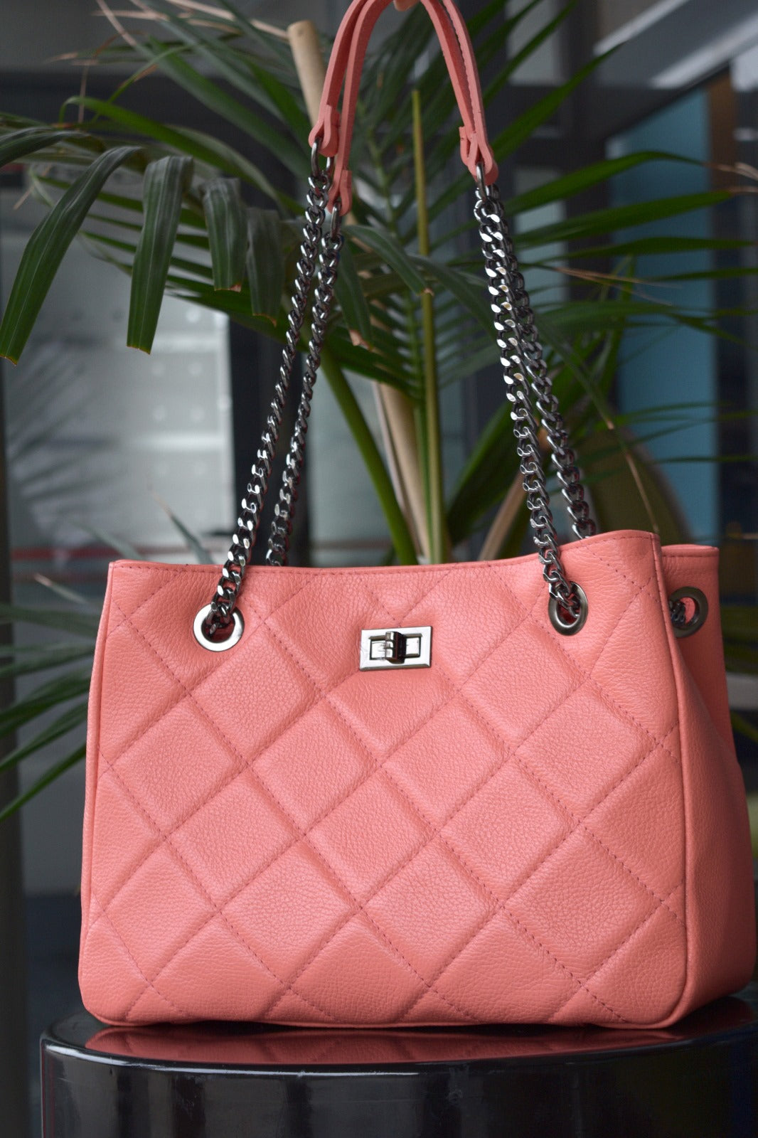 Geantă de damă de culoare peach, fabricată din piele de înaltă calitate. Geanta are două compartimente cu interior căptușit și un compartiment despărțitor suplimentar cu fermoar. Dispune de două buzunare: un buzunar pentru telefon și un buzunar mic cu fermoar. Prezintă închidere prin clipsare și deține elemente metalice de culoare aurie. Dispune de două bretele metalice din lanț care permit purtarea acesteia ca și geantă crossbody.