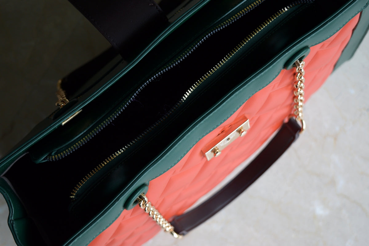 Geantă de damă de culoare portocalie,fabricată din piele de inaltă calitate.Geanta are 1 compartiment cu interior captușit și dispune de două buzunare:un buzunar pentru telefon si un buzunar mic cu fermoar.Prezintă inchidere cu fermoar metalic și prin clipsare si deține elemente metalice de culoare aurie.