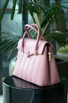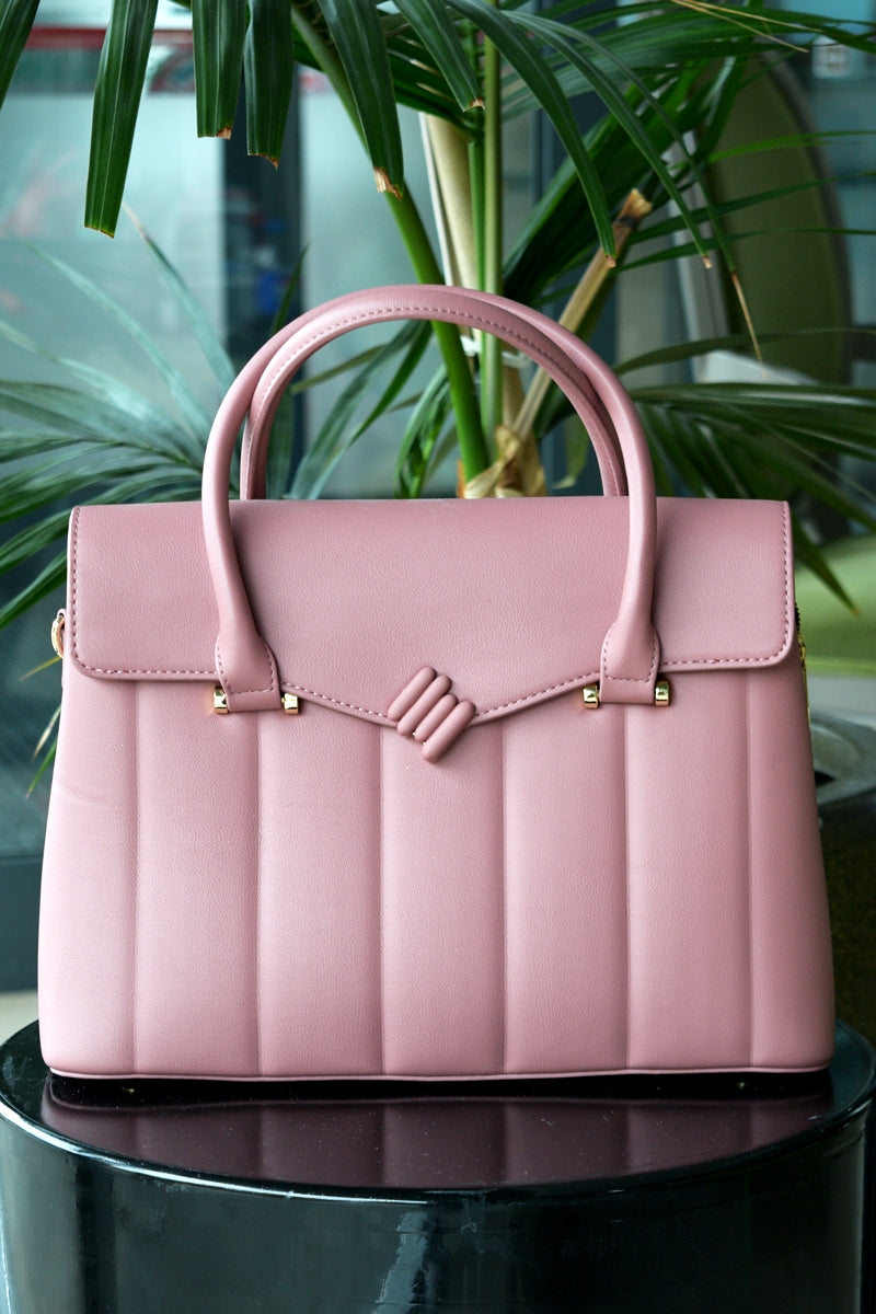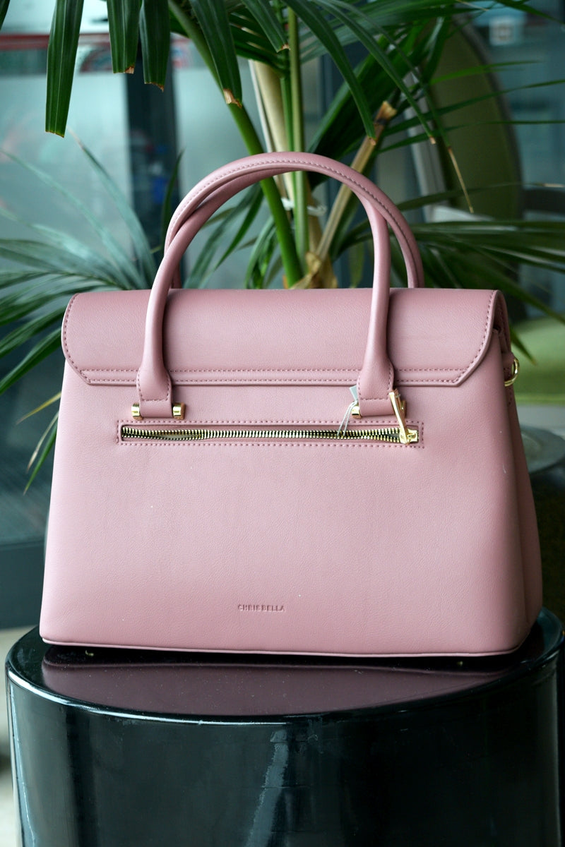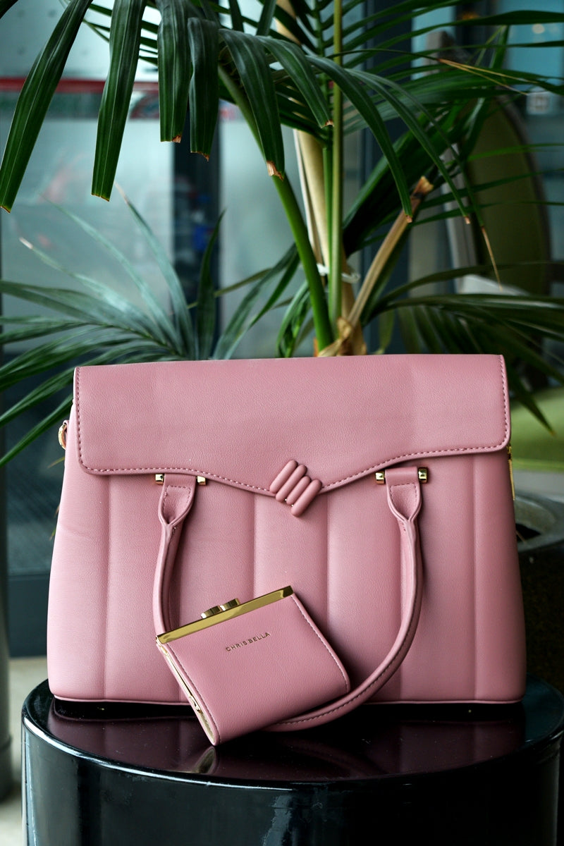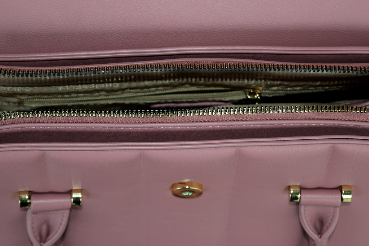 Geantă de damă de culoare roză, fabricată din piele de înaltă calitate. Geanta are 1 compartiment cu interior căptușit și dispune de două buzunare: un buzunar pentru telefon și un buzunar mic cu fermoar. Prezintă închidere prin clipsare și deține elemente metalice de culoare aurie. Dispune de un cordon lung care permite purtarea acesteia ca și geantă crossbody. Conține, bonus, un portofel.