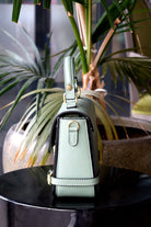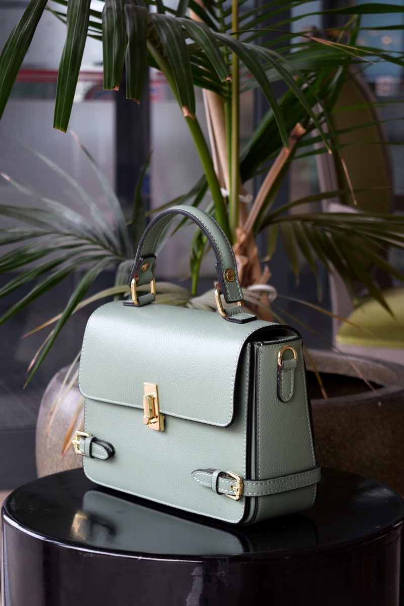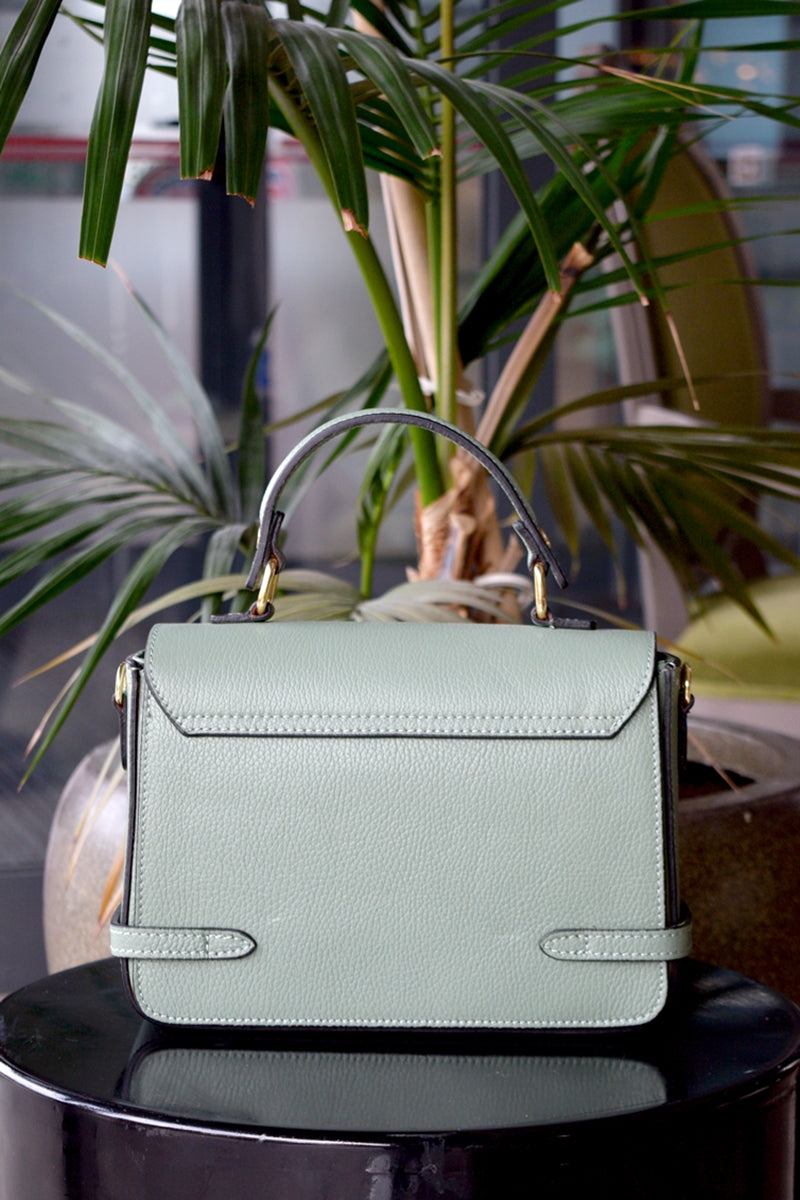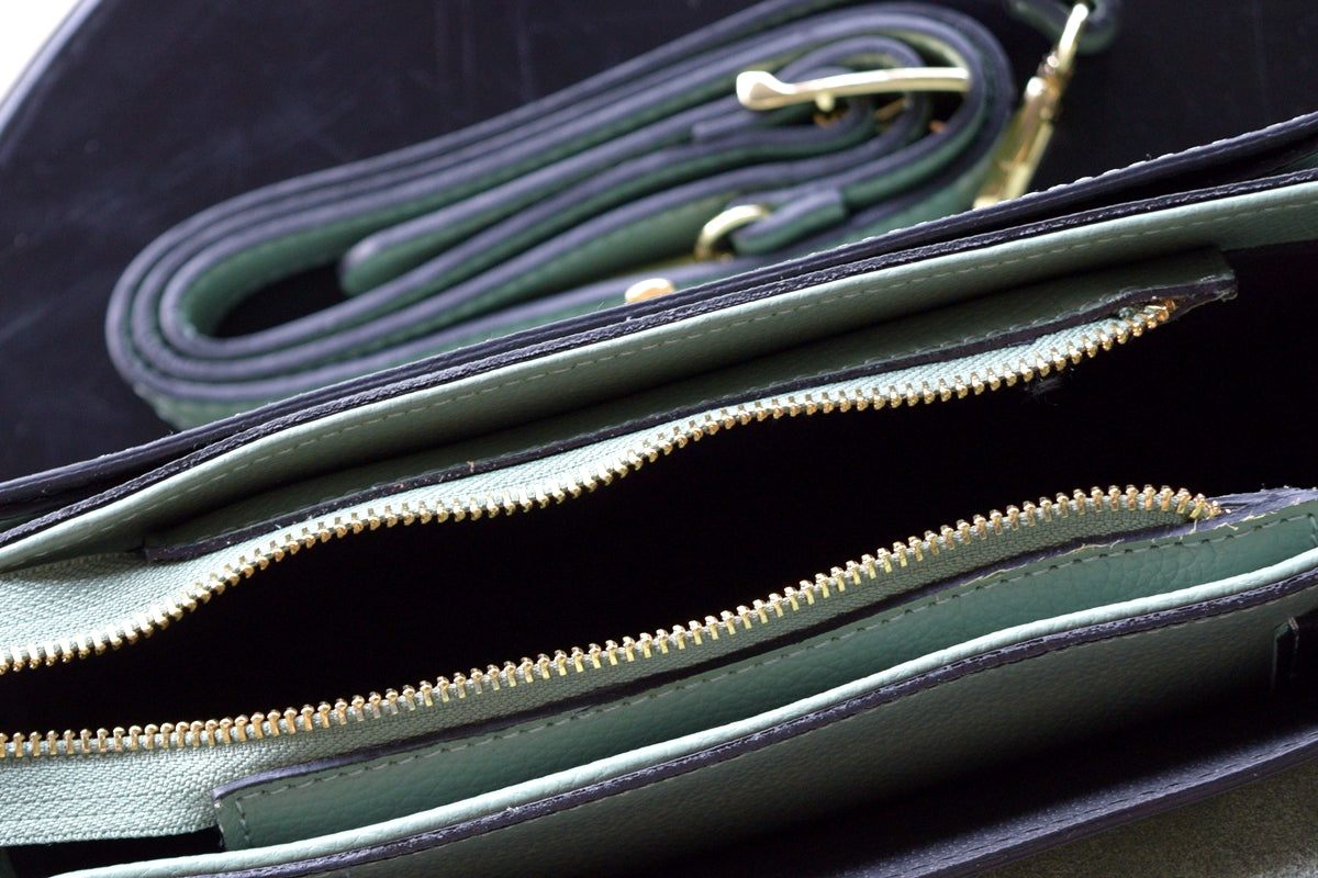 Geantă de damă de culoare verde ou-de-rață, fabricată din piele de înaltă calitate. Geanta are 1 compartiment cu interior necăptușit și dispune de două buzunare: un buzunar pentru telefon și un buzunar mic cu fermoar. Prezintă închidere prin clipsare și deține elemente metalice de culoare aurie. Dispune de un cordon lung care permite purtarea acesteia ca și geantă crossbody.