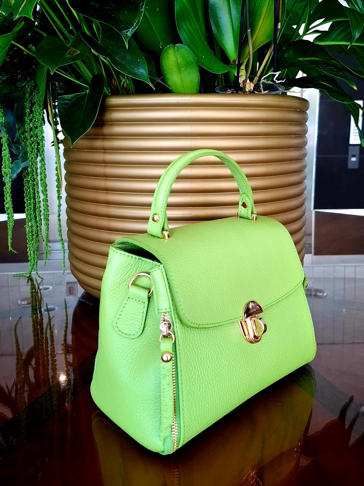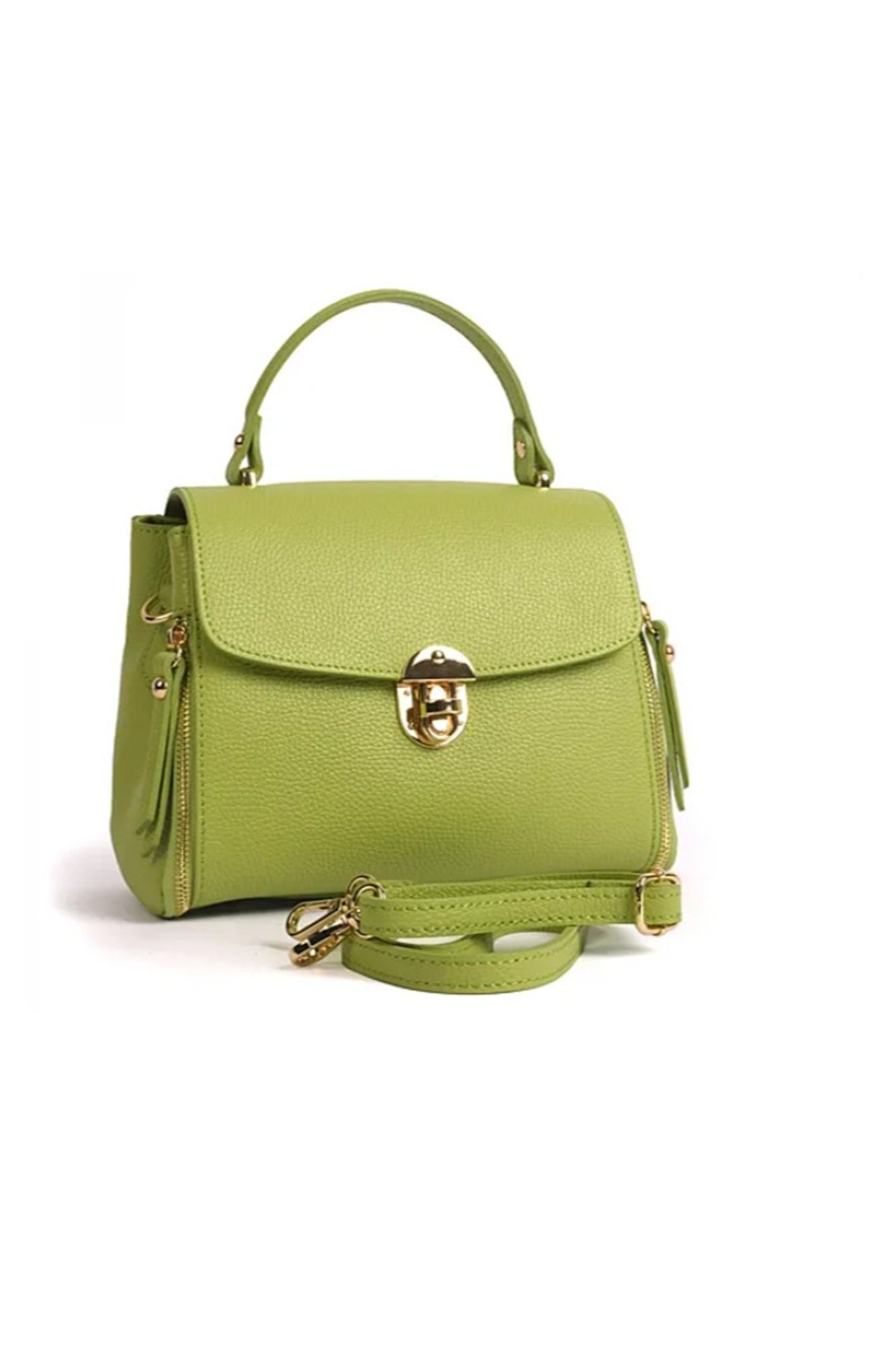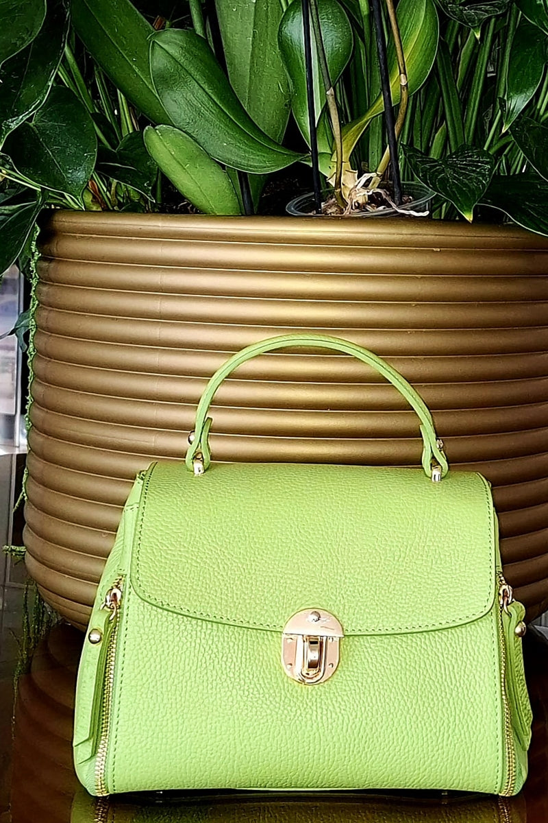 Geanta pentru femei VERA ITALY "Limeli", de culoare verde, este fabricată din piele naturală de înaltă calitate în Florența, Italia. Are 3 compartimente cu un compartiment median cu fermoar. Are un buzunar interior cu fermoar. Are un buzunar practic pentru telefonul mobil. Geanta se închide cu cataramă metalică, clapă. Elementele metalice sunt aurii. Poate fi purtata în mână, Poate fi purtata ca geanta crossbody. Dimensiuni: 24 x 18 x 9 cm (aproximativ). Lungimea curelei lungi crossbody: 127 cm. Geantă autentică italiană din piele.