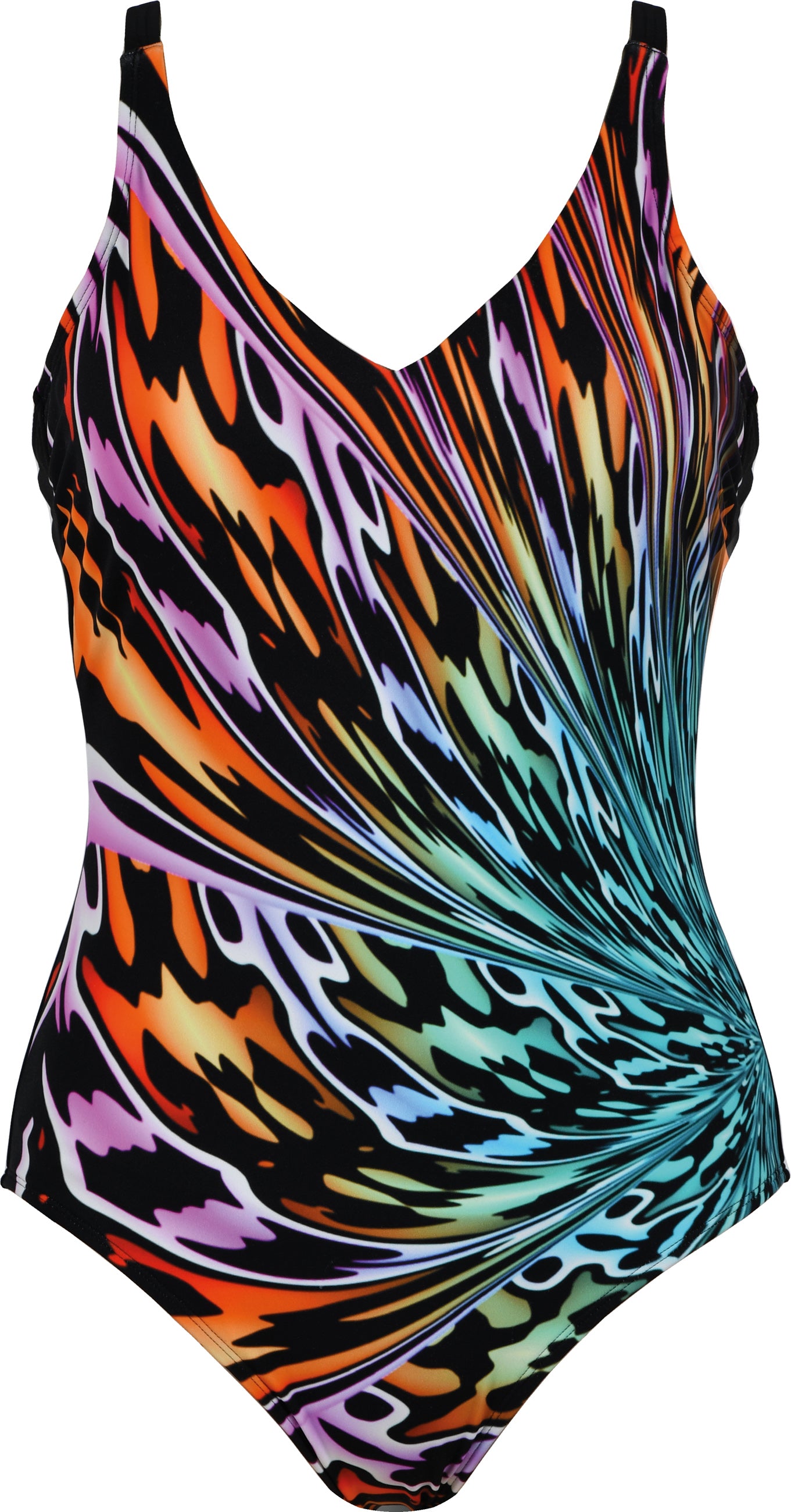 · Conceput pentru a contura ușor corpul și a accentua formele, acest costum de baie elegant prezintă cupe largi, căptușite, fără armătură, care creează un decolteu feminin în V.Datorită benzii elastice cusute sub sâni, costumul de baie se adaptează bine circumferinței și oferă suficient sprijin.Partea din față este căptușită cu o plasă modelatoare specială, cu elasticitate limitată - rezultatul este o talie vizual mai subțire și un abdomen plat, chiar și în timpul mișcării active.Bretelele sunt reglabile la spate, facilitând ajustarea la silueta ta. Există un decupaj clasic semicircular pe spate, iar partea de jos este mai mulată, oferind confort și o senzație de libertate.