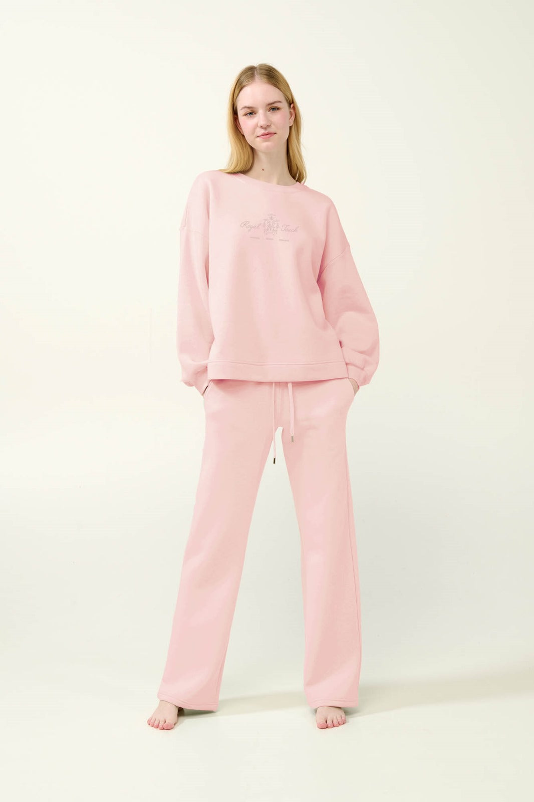 Bluza are mâneci cu manșete și croi clasic, care asigură libertate de mișcare, iar pantalonii dispun de o formă dreaptă, modernă, ce oferă echilibru între confort și eleganță. Imprimeul rafinat „Royal Touch” de pe piept adaugă o notă subtilă și feminină ansamblului.
