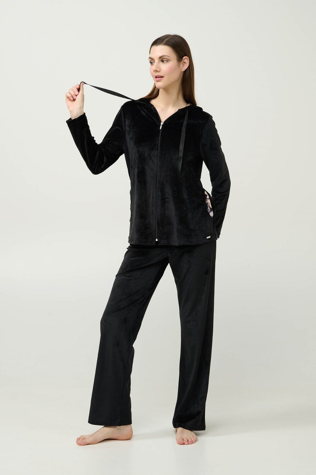 Răsfață-te cu un confort rafinat în acest set de lounge din catifea , creat pentru a te menține elegantă și relaxată în sezonul rece. Bluza cu fermoar dispune de glugă practică și buzunare laterale decorate cu imprimeu floral în acuarelă, într-o paletă caldă și sofisticată.