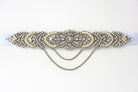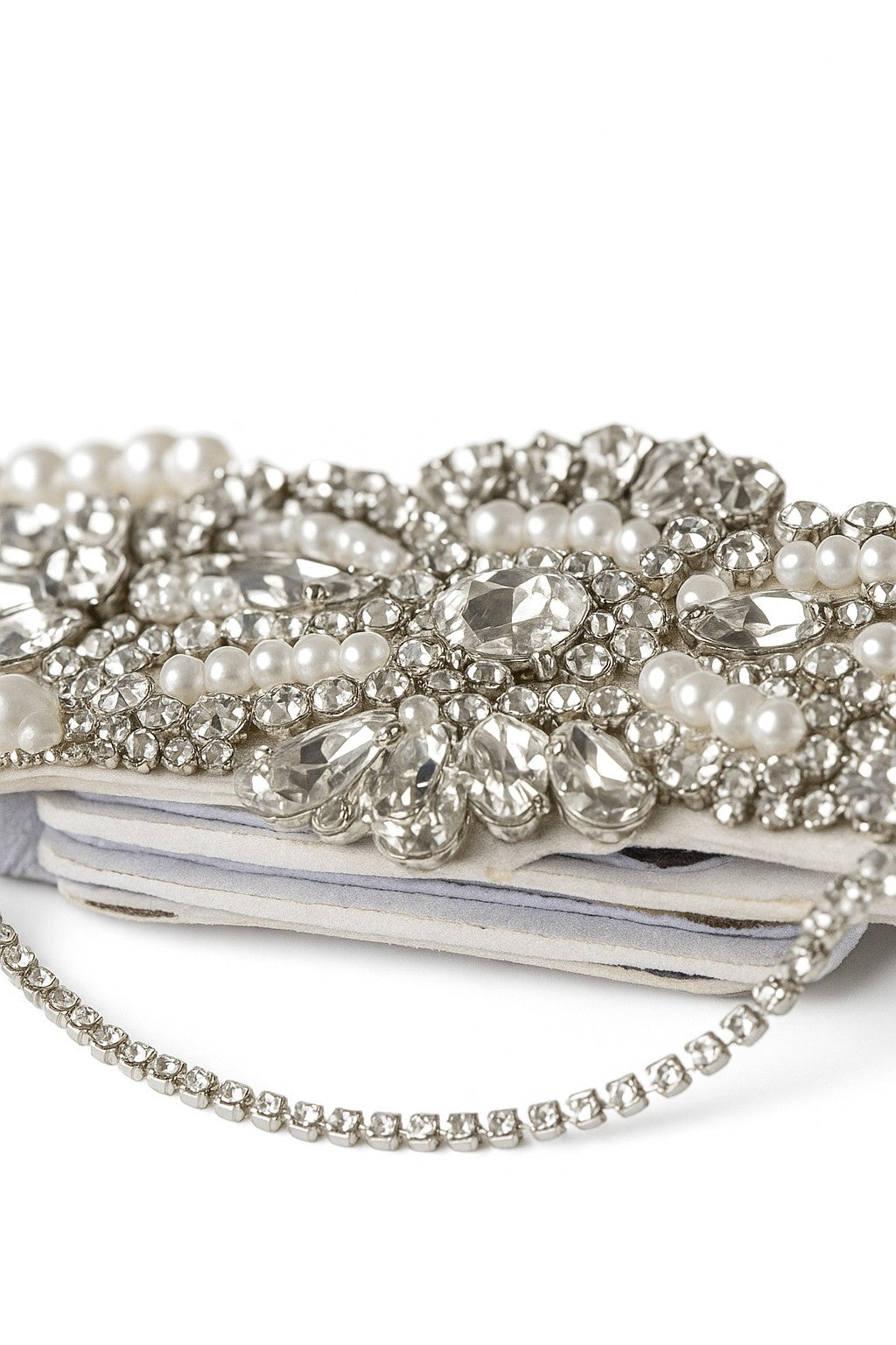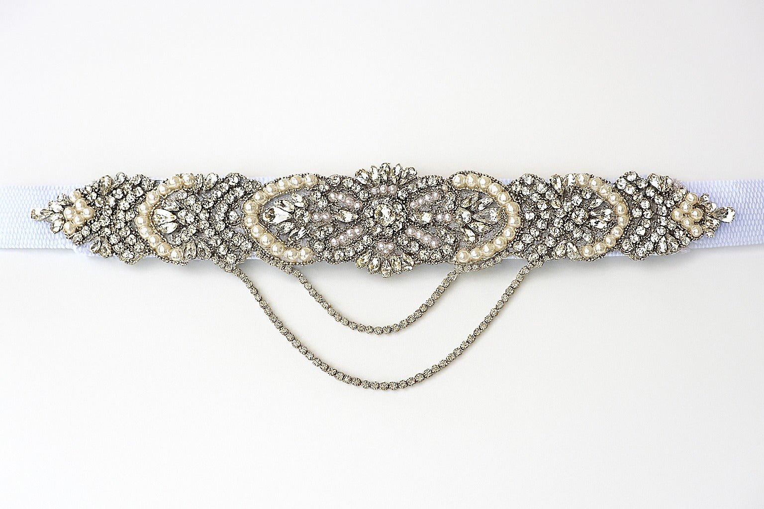 Centură elastică, albă, accesorizată. Pietrele decorative sunt lipite pe o suprafata din piele cusută la rândul său pe centură . Închiderea este realizată prin capse.