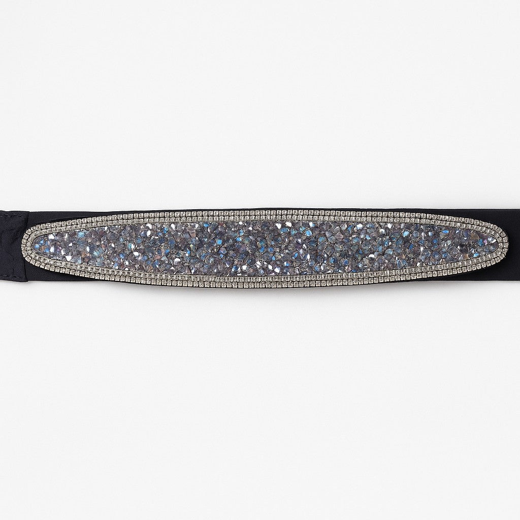 Centură neagră din panglică dublată de broderie elegantă, accesorizată. Pietrele nepretioase sunt lipite pe o suprafață textilă atașată la rândul său pe centură. Închiderea este realizată prin legarea centurii.
