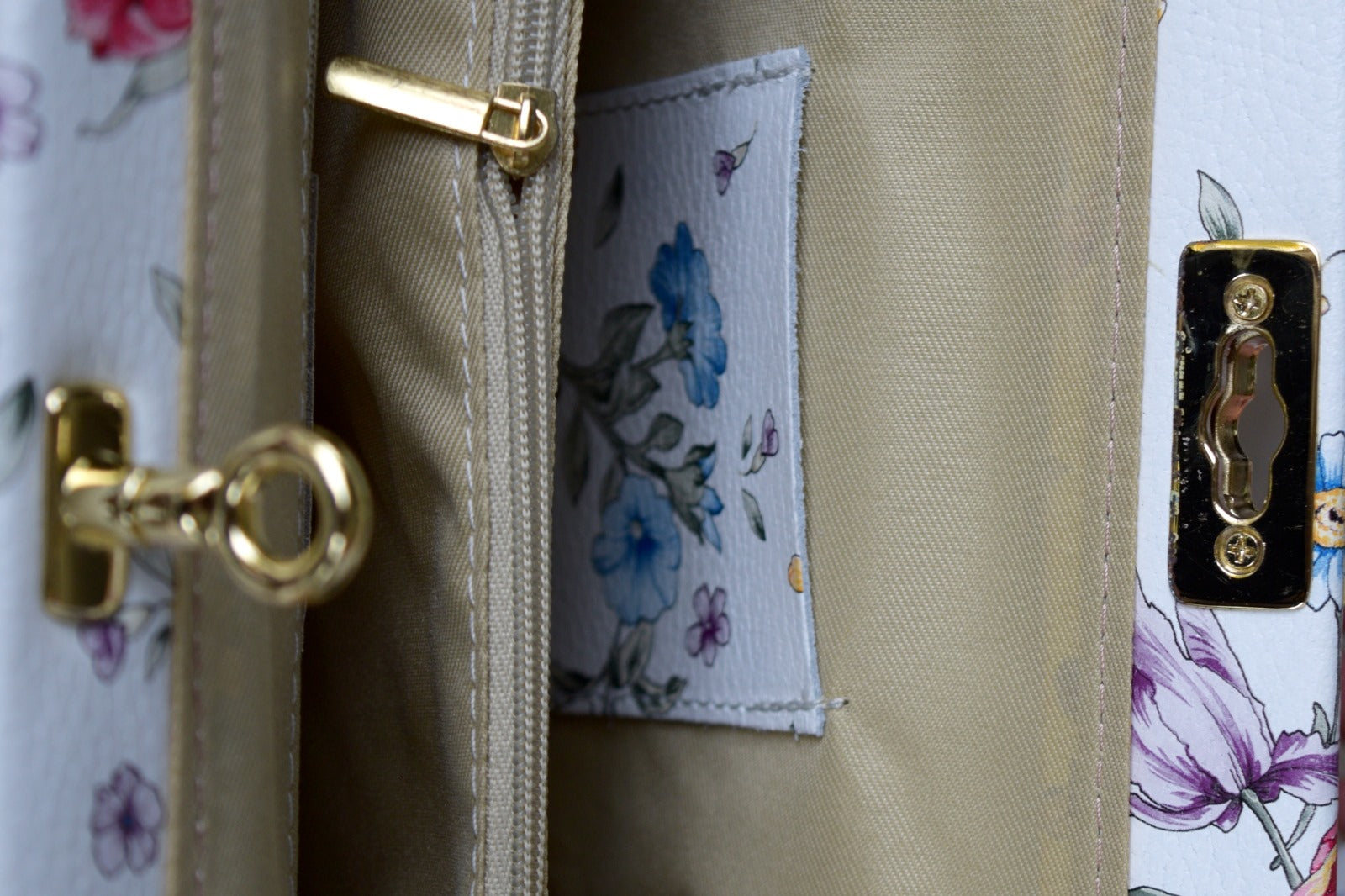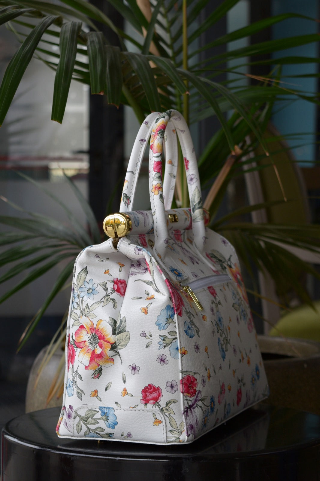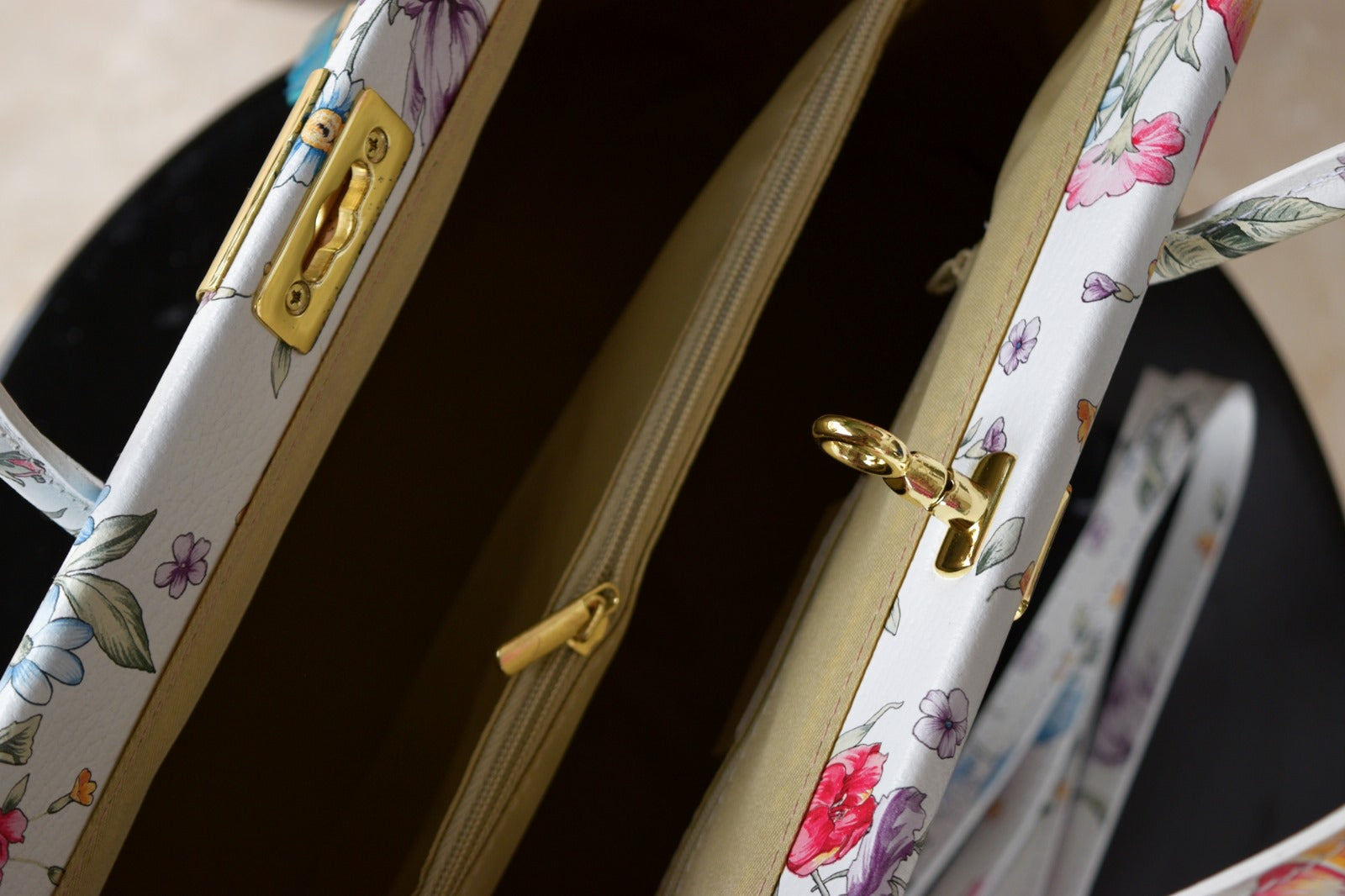 Geantă de damă albă cu imprimeu floral – eleganță și rafinament în fiecare detaliu