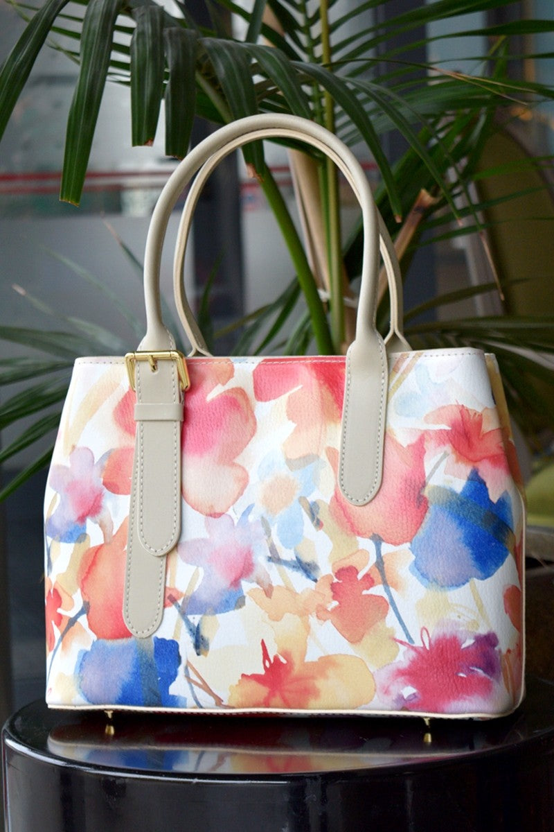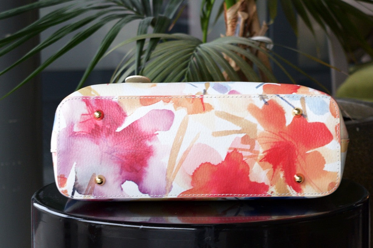 Geantă de damă de culoare albă cu model floral, fabricată din piele de înaltă calitate. Geanta are 2 compartimente cu interior căptușit și dispune de două buzunare: un buzunar pentru telefon și un buzunar mic cu fermoar. Prezintă închidere cu fermoar metalic și deține elemente metalice de culoare aurie. Dispune de un cordon lung care permite purtarea acesteia ca și geantă crossbody.