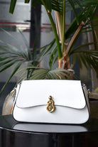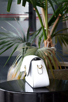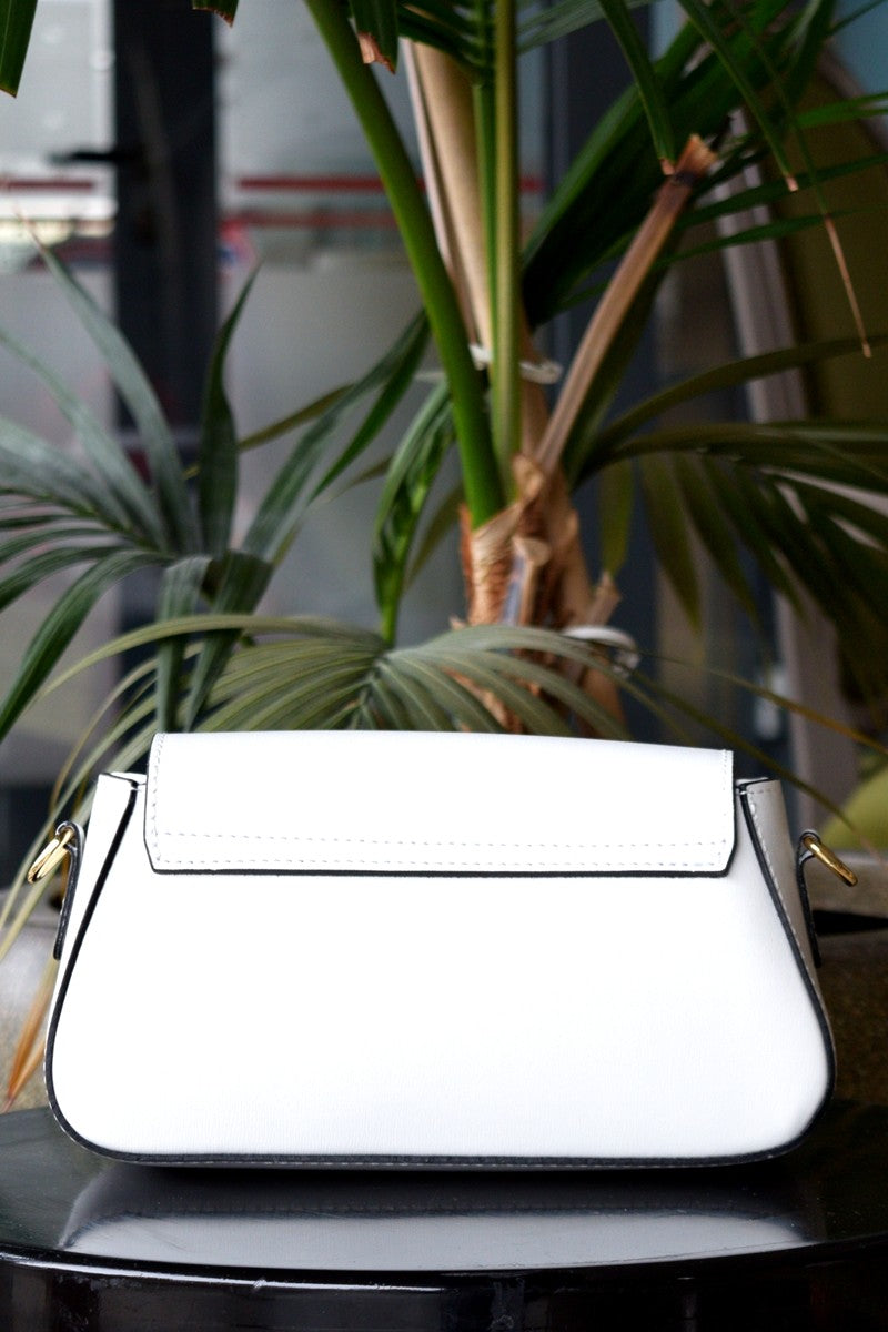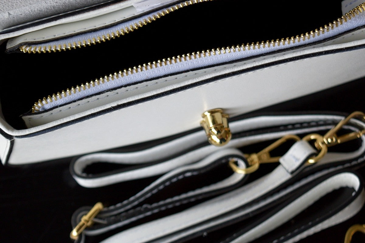 Geantă de damă de culoare albă, fabricată din piele de înaltă calitate. Geanta are 1 compartiment cu interior căptușit și dispune de un buzunar mic cu fermoar la interior. Prezintă închidere cu fermoar metalic la interior și închidere prin clipsare la exterior, și deține elemente metalice de culoare aurie. Dispune de un cordon lung care permite purtarea acesteia ca și geantă crossbody și de o bretea pentru purtarea pe umăr.