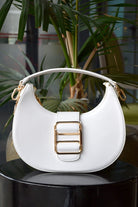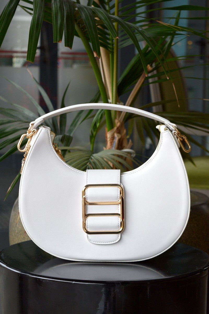 Geantă de damă de culoare albă, fabricată din piele de înaltă calitate. Geanta are 1 compartiment cu interior căptușit și dispune de două buzunare: un buzunar pentru telefon și un buzunar mic cu fermoar. Prezintă închidere cu fermoar metalic și închidere prin clipsare, și deține elemente metalice de culoare aurie. Dispune de un cordon lung care permite purtarea acesteia ca și geantă crossbody.