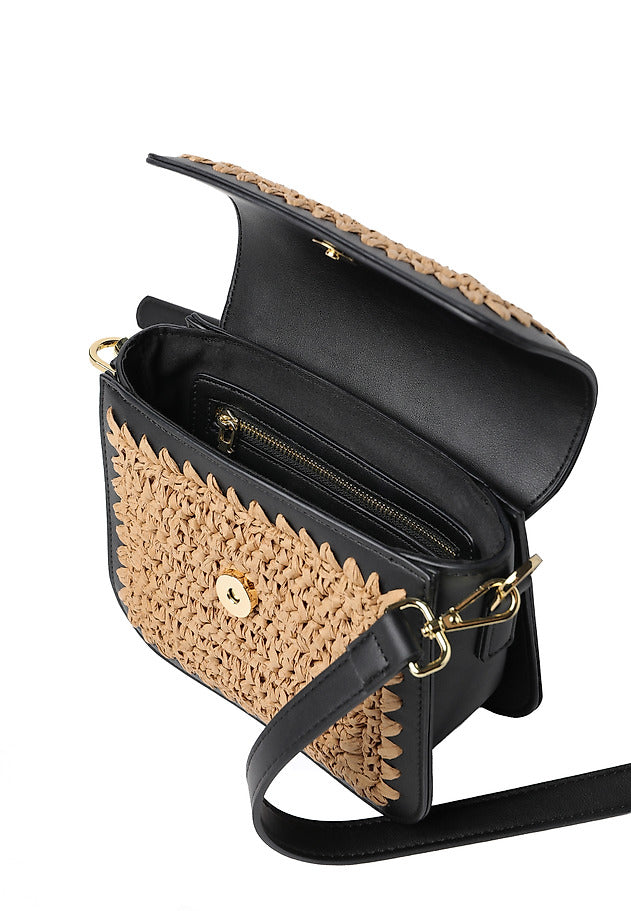 O geantă elegantă confecționată din 50% paie de hârtie împletită. Echipată cu un buzunar spațios și două compartimente interne pentru documente. Dispune de un buzunar extern suplimentar. Model are bretea ajustabilă și detasabilă. Închidere se realizeaza cu clapetă magnetică.