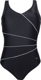 · Costum de baie întreg pentru femei, ideal pentru toate tipurile de corp și vârste. Proiectat cu bretele late. Ajustare excelentă care conturează și flatează corpul, cu întărire ușoară. Culoare neagră cu tăietură clasică. Ideal pentru piscină și pentru femeile care practică sporturi.